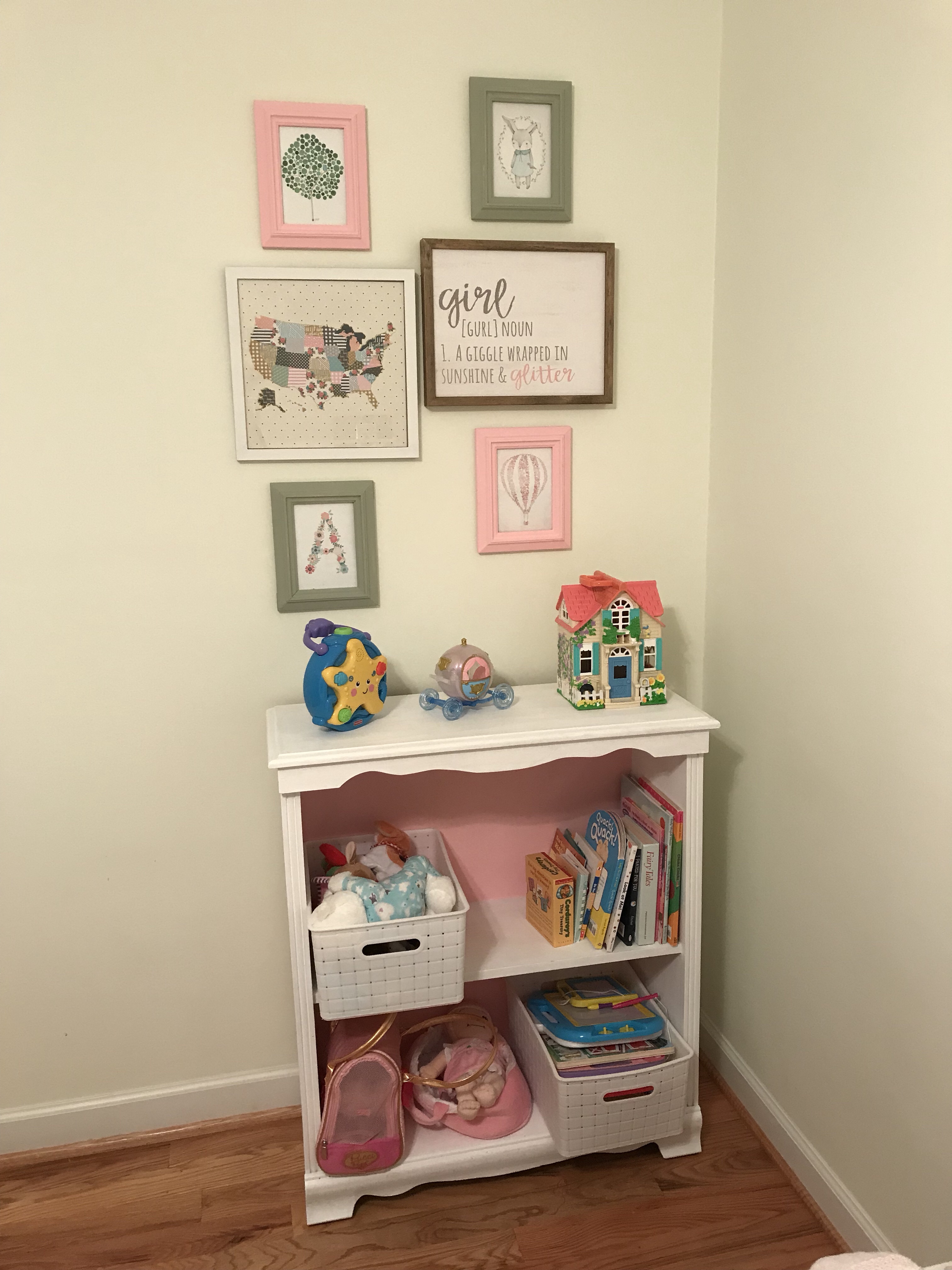 I painted this shelf, which once occupied my childhood bedroom, with the intent of adding baskets for toy storage. I also repurposed and even painted some of the picture frames from her nursery. The US map is a framed piece of scrapbook paper.