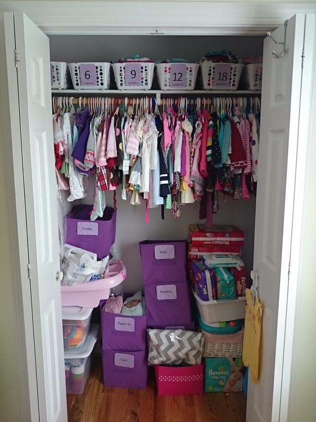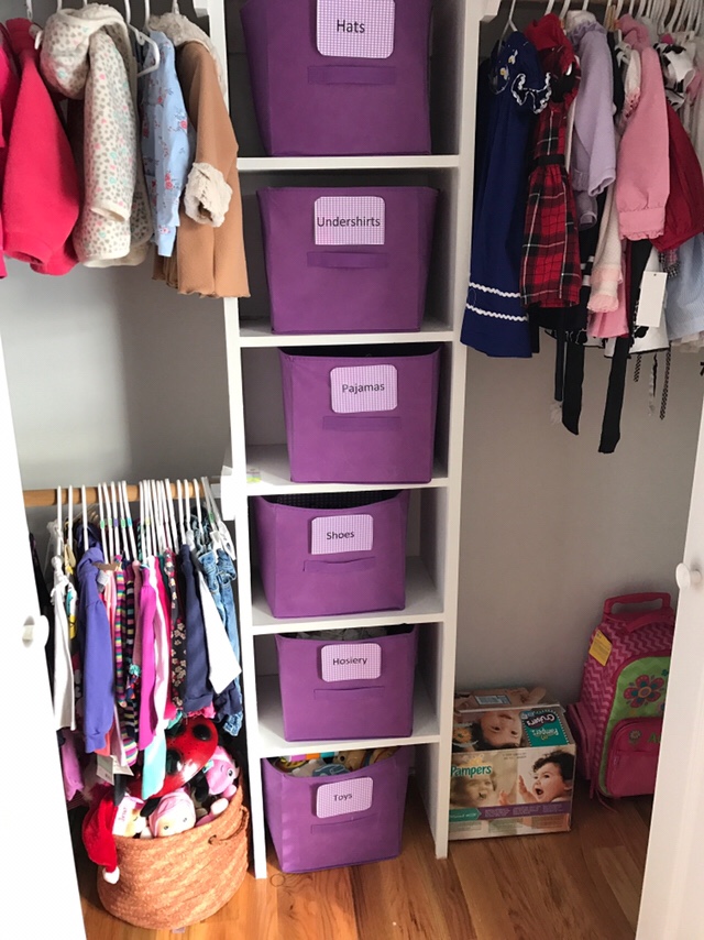 I then took some old diaper boxes and covered them with fabric. I already had the baskets on the top shelf.