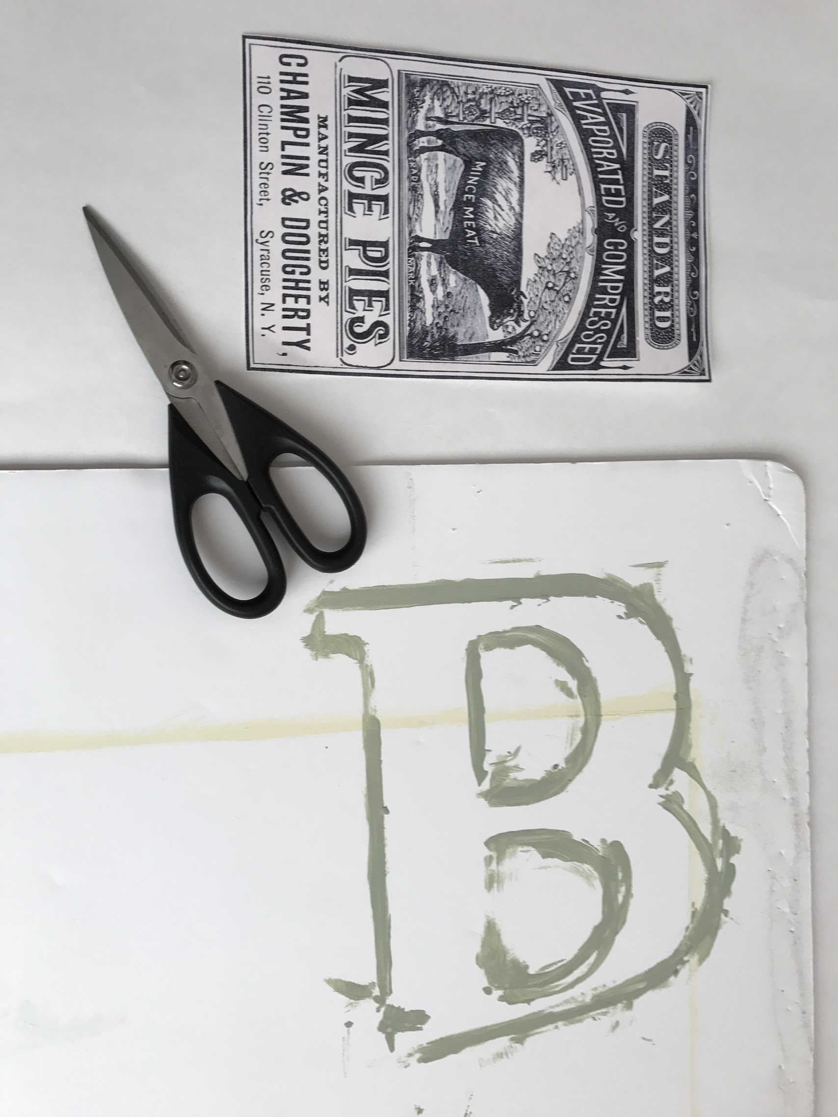 I decided to print it on card stock and glue it to a piece of foam core board. I had a piece of foam board I’d been using to cover my table when I painted wood letters. You can still see the green outline of a B from when I made our wreath last spring.