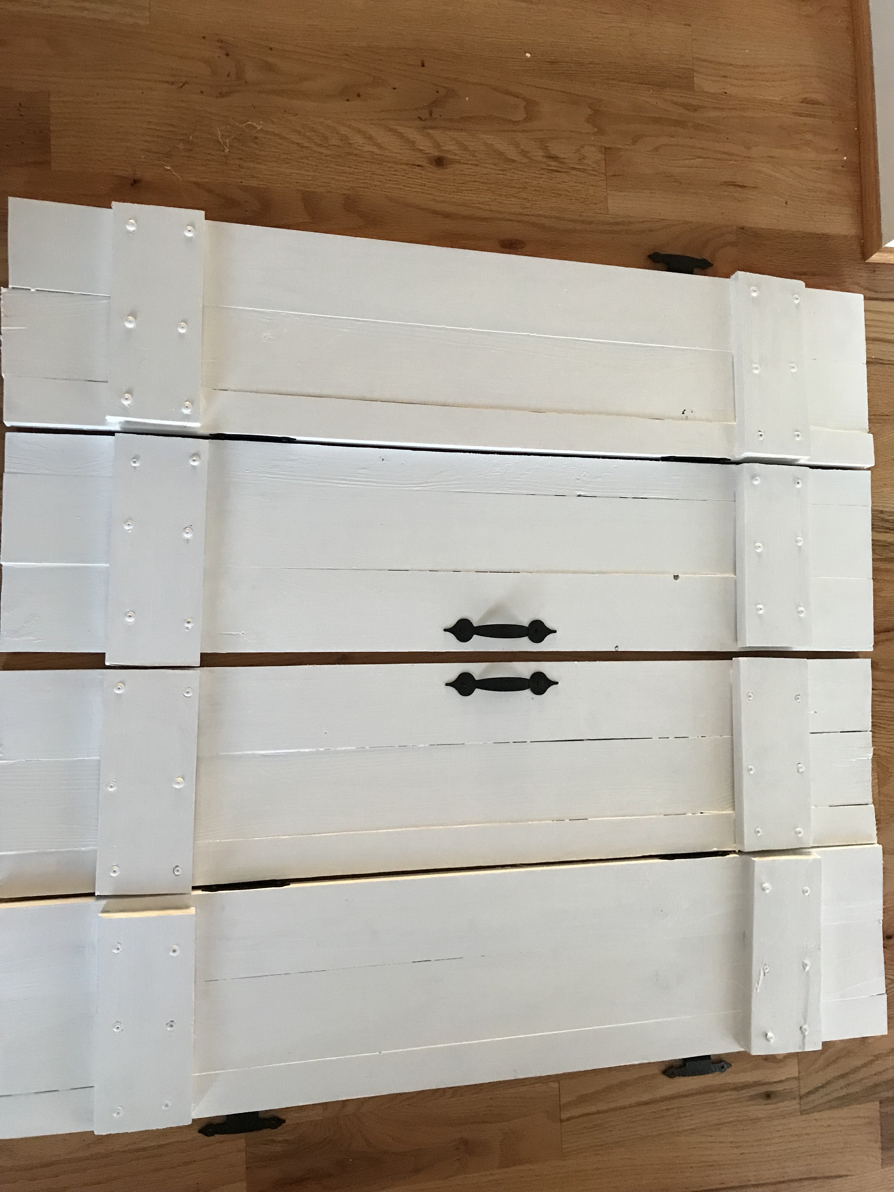 I wanted something more unique. I spotted some scrap wood in my garage and I had an idea: why not create some simple, rustic shutters? I measured the opening and cut the wood. Then, I bought some cute hinges and handles.