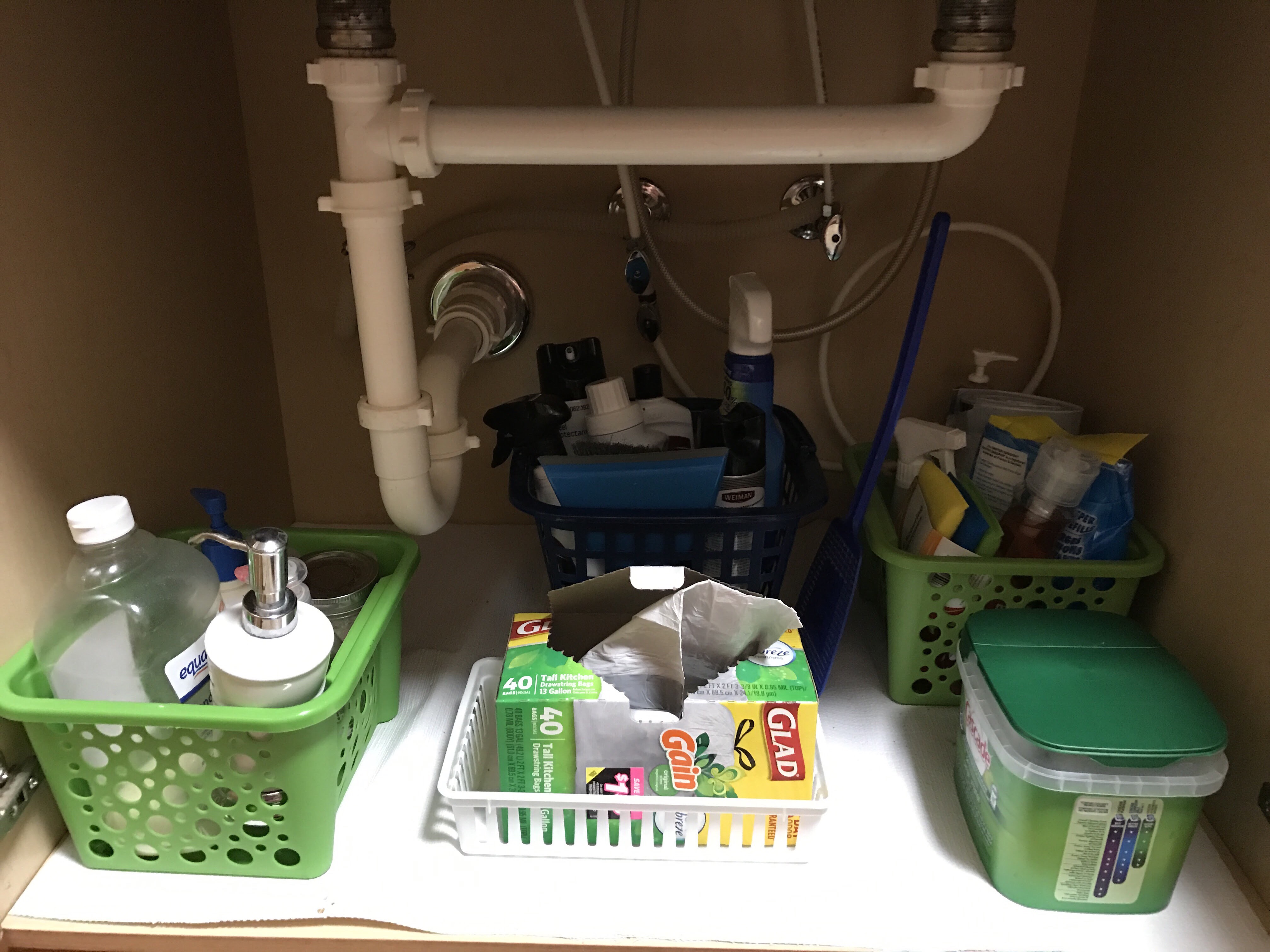 Our kitchen sink cabinet was looking a bit cluttered and crammed full. I took everything out of it and wiped it out. I then moved the stool, candle tarts and dish towels back to their proper places.