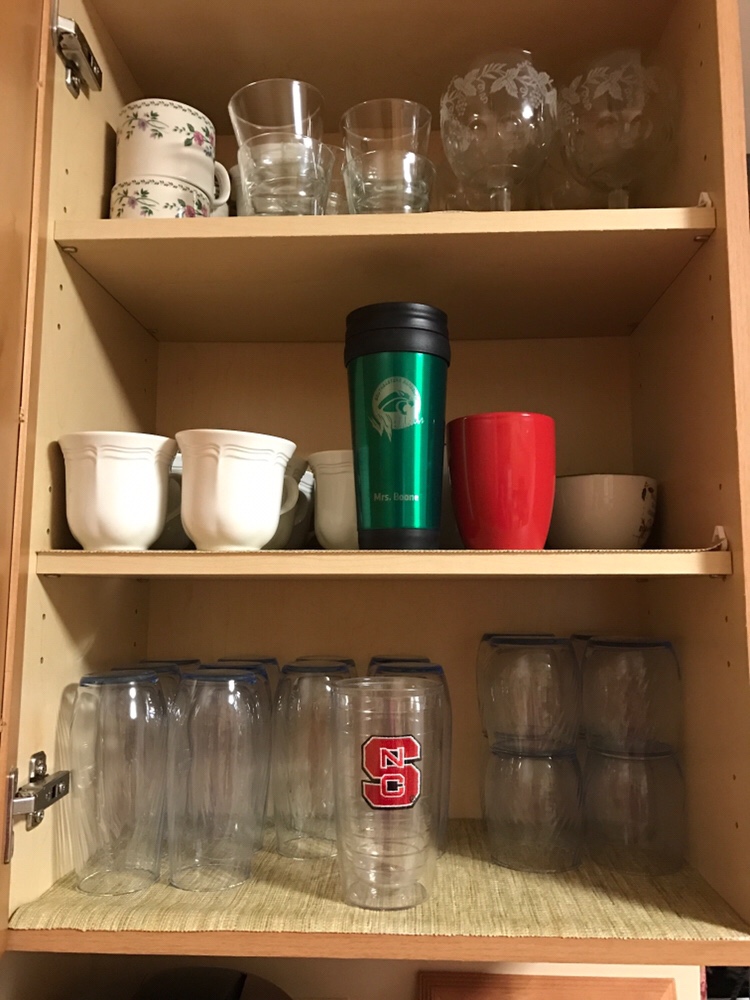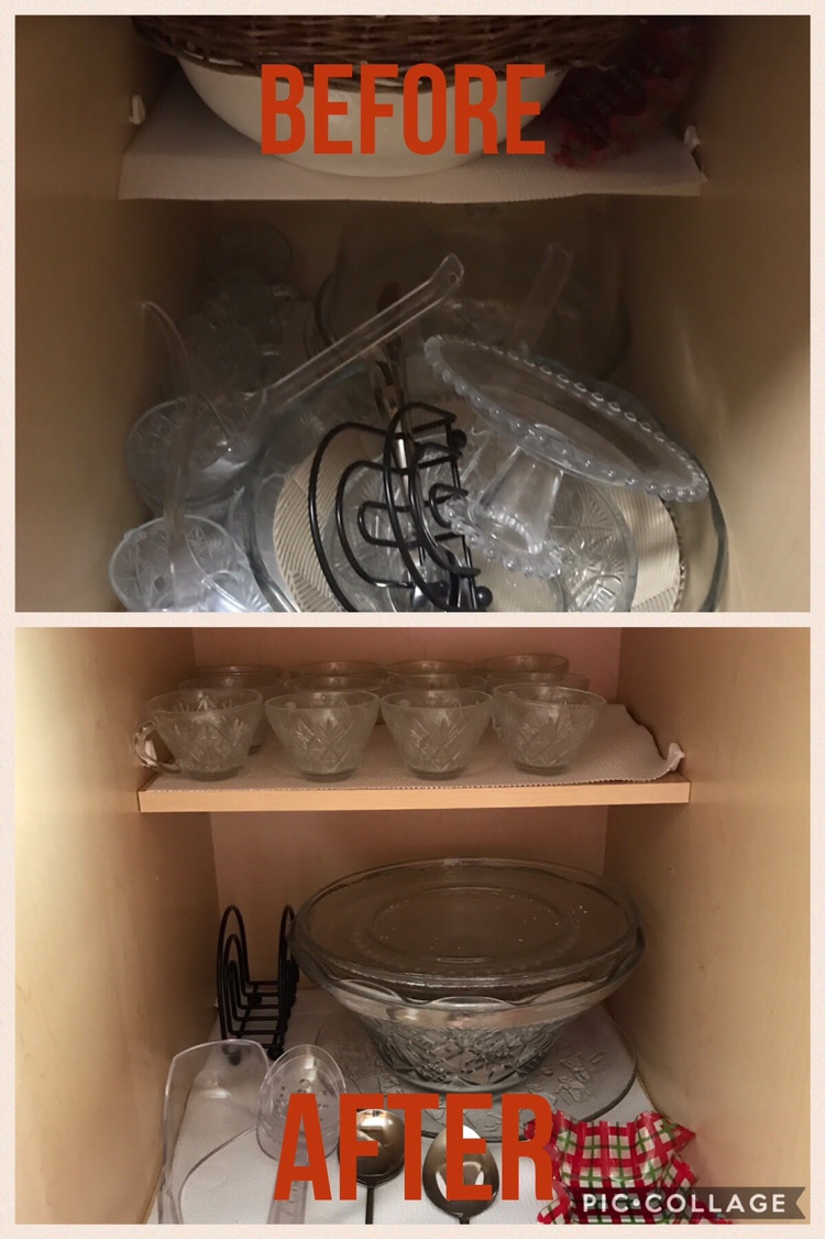 Then, I tackled some other cabinets. I got rid of all the broken or stained plastic ware, and all the extra lids. I straightened our serveware cabinets