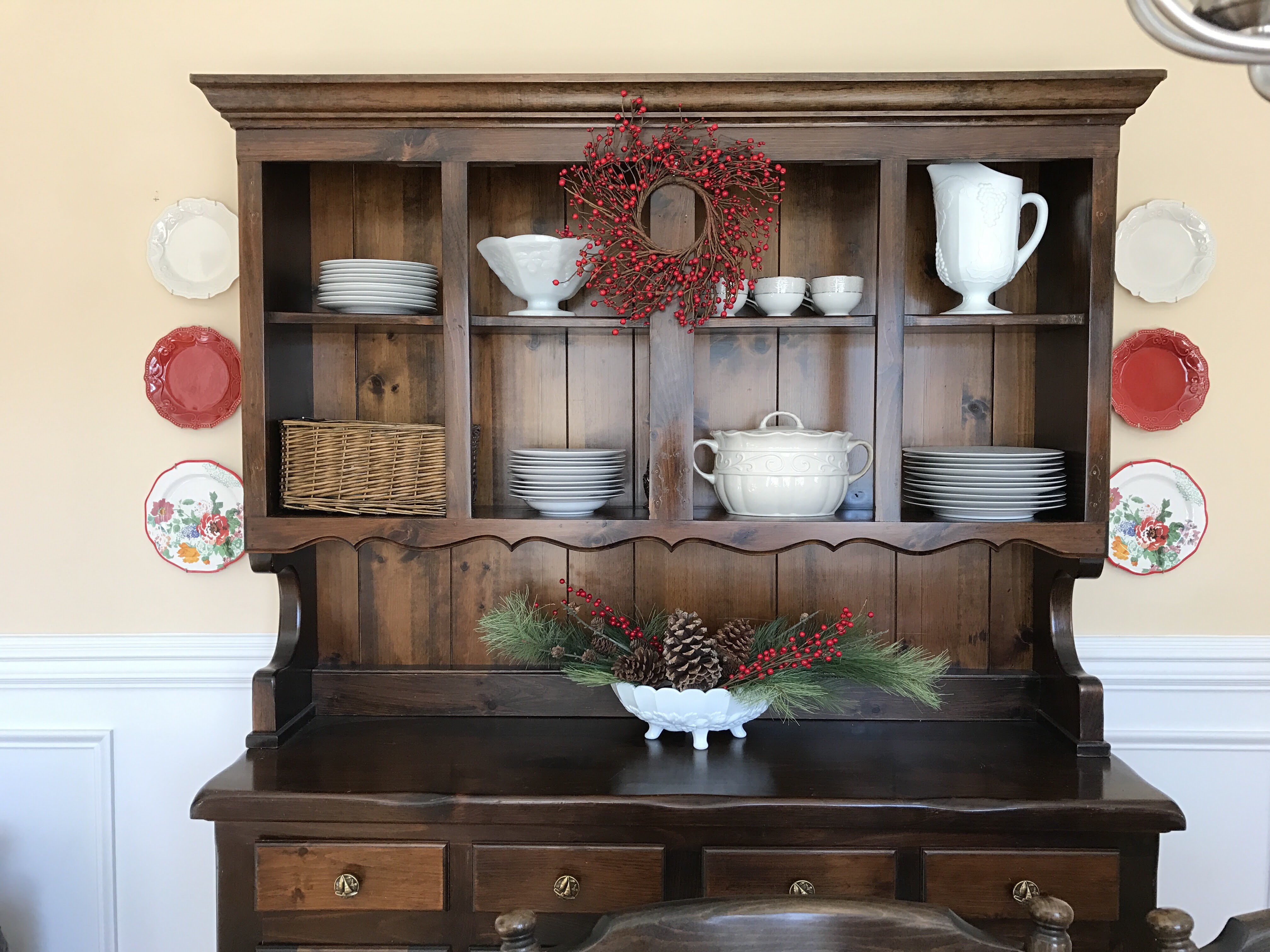 See that basket on my china hutch? It’s been everywhere. It’s been in my bathroom, my kitchen, my office, and now it landed in the dining room. Shop your house to see if you may already have something you can use before you buy anything new.