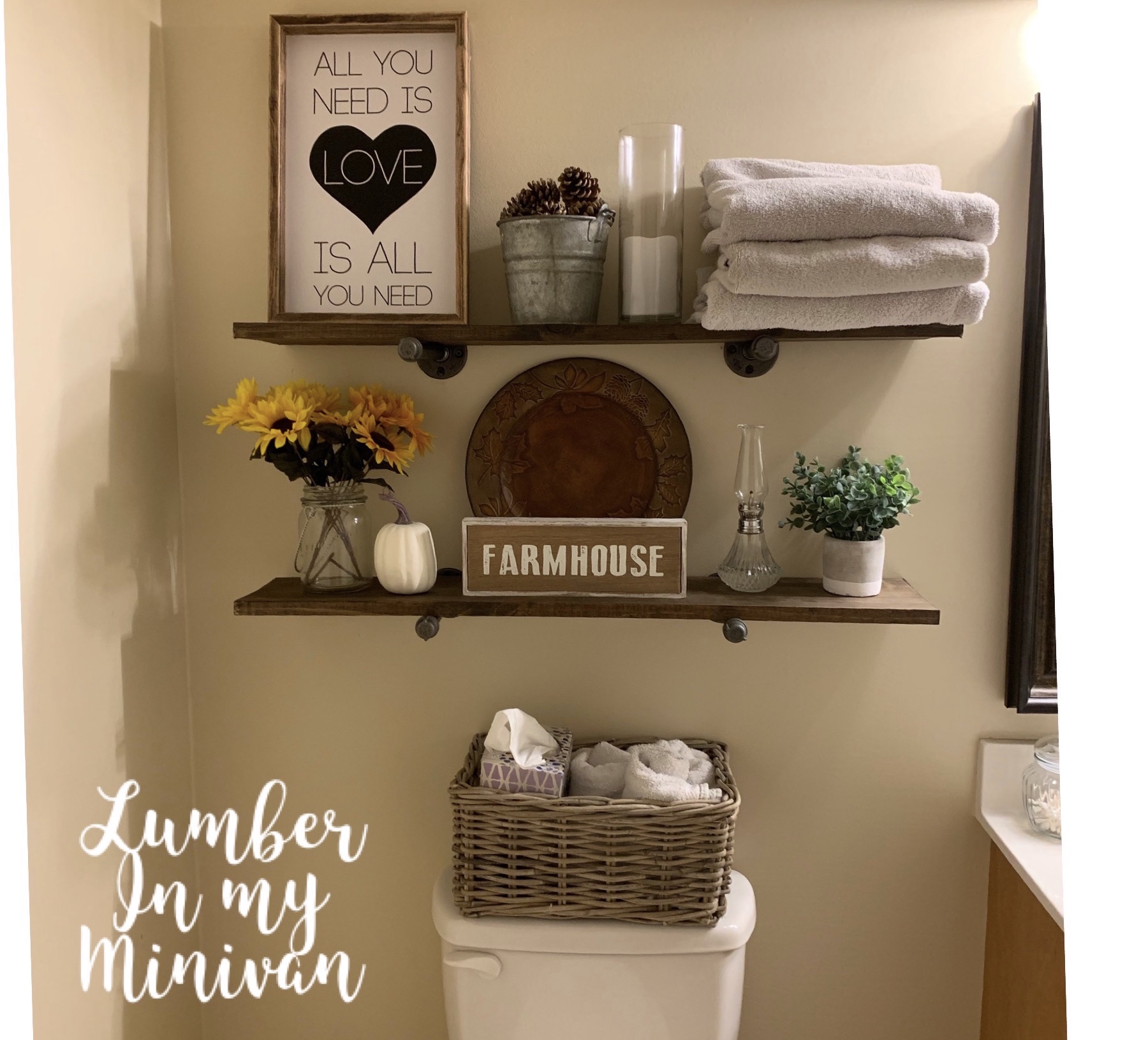 The shelves in our master bath look so cute with the sunflowers and pine cones.