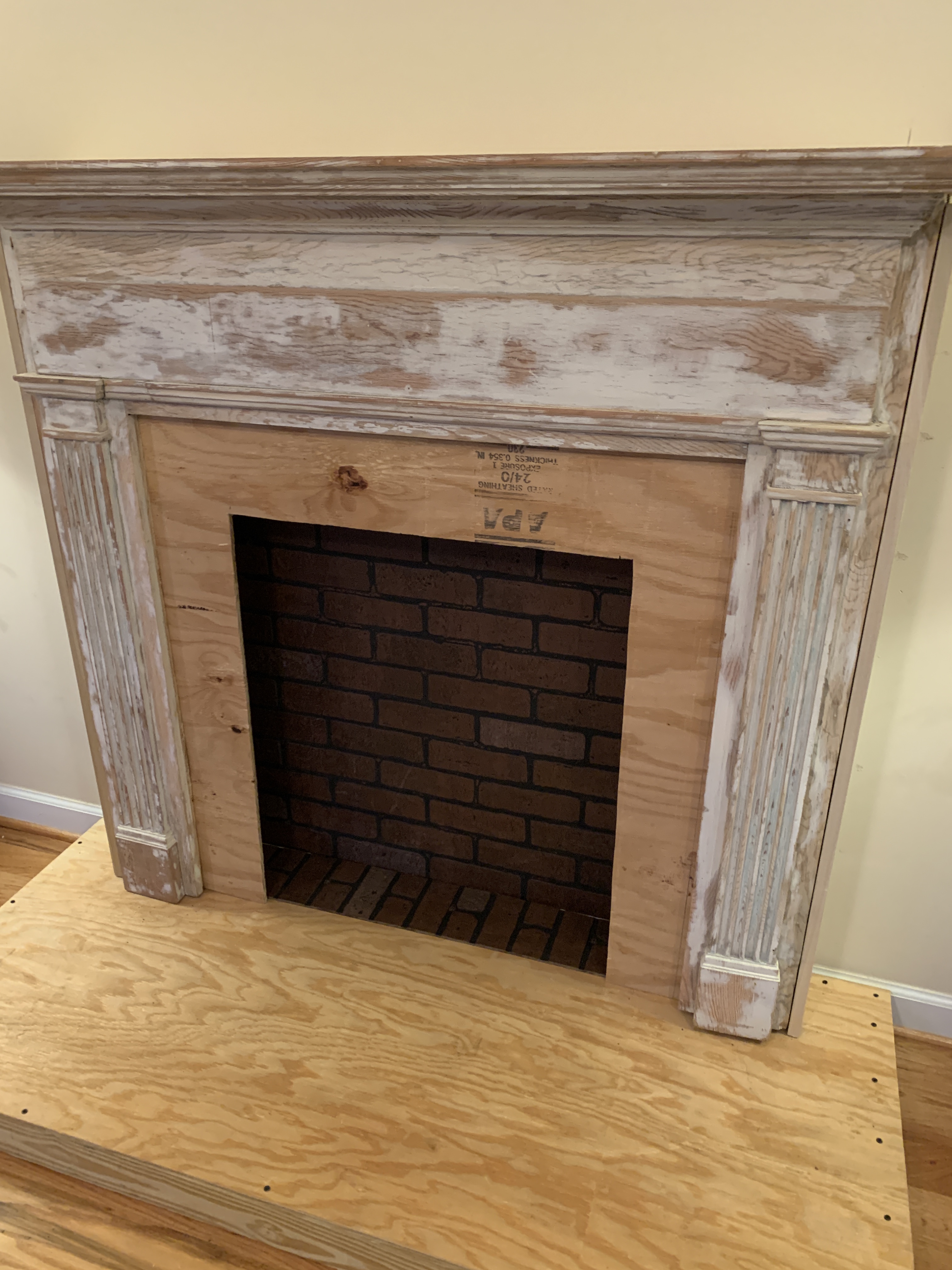 When we last left you, our beautiful antique mantle with its faux firebox looked like this: