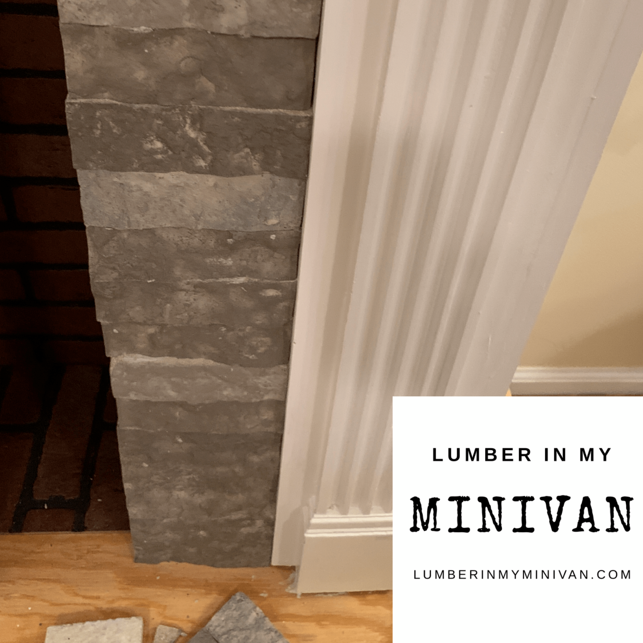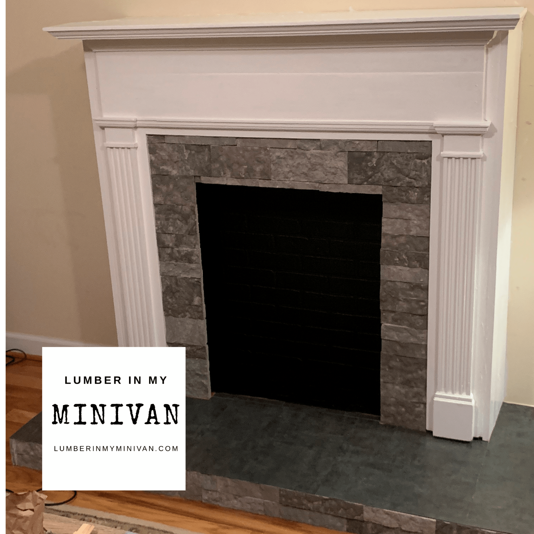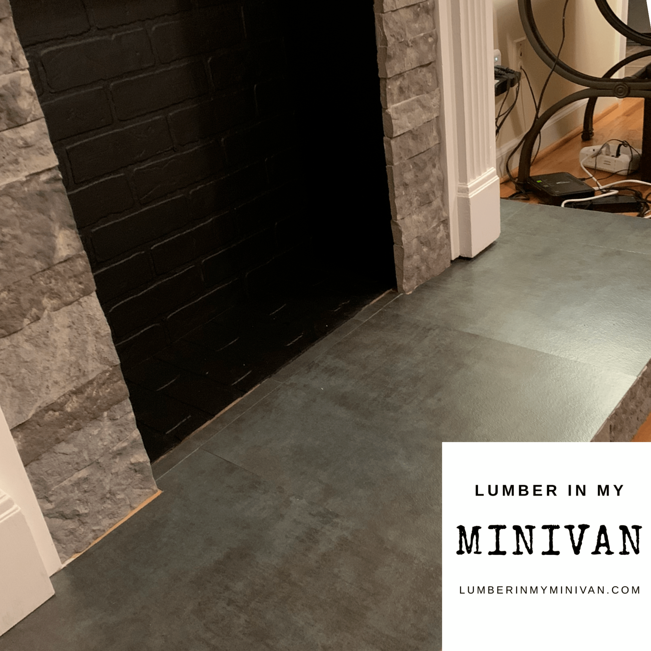 We then laid faux slate vinyl tiles across the top of the hearth. We may upgrade it later to real slate but I am loving how this looks, and how little it cost.