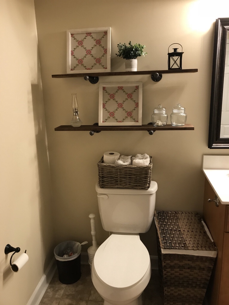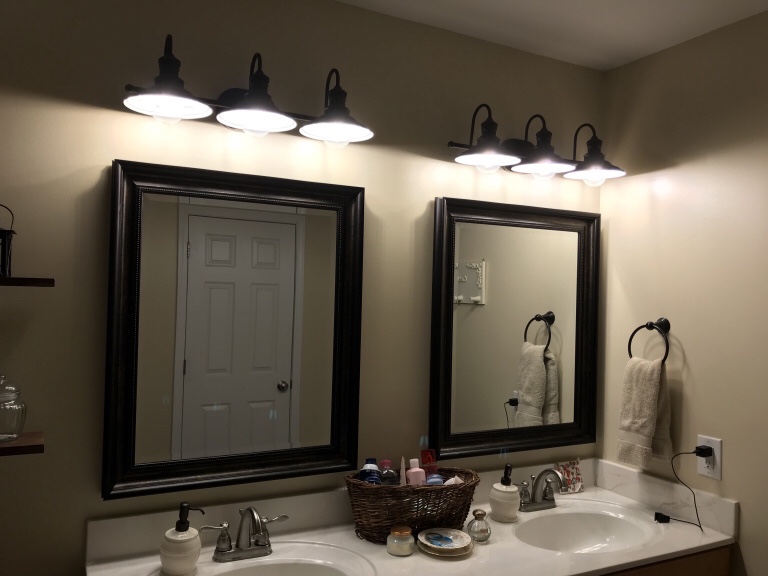 We just did a small remodel of our master bathroom. We replaced mirrors, hardware and light fixtures. We eventually plan to replace the bathtub and surround and flooring as well, but it simply isn’t in the budget right now. So we started with the cheapest, easiest items on our “master bath to-do list” and we completed those.