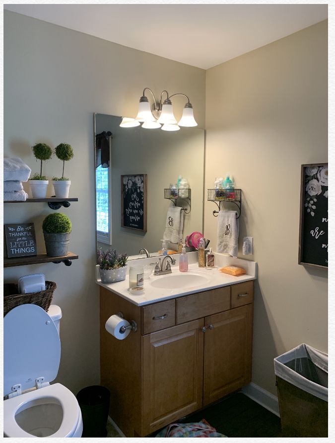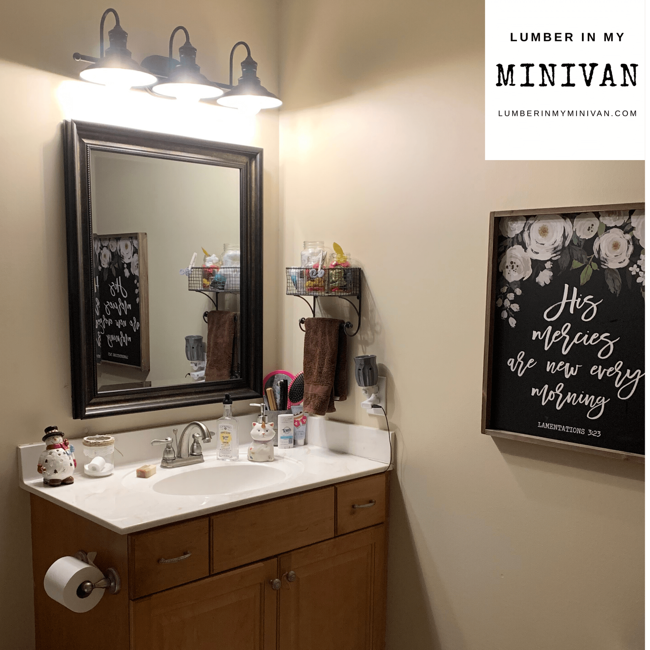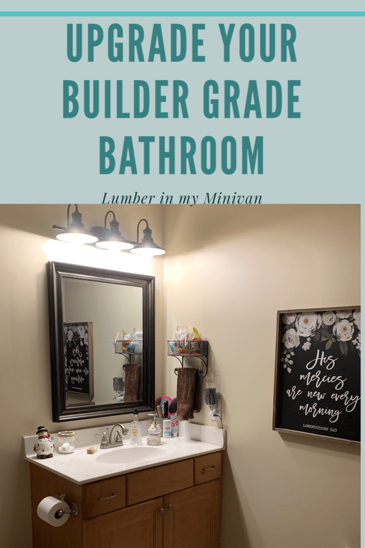 Our hall bath needed a little help. It was the poster child for bland and boring. Plate glass mirror? Check. Builder grade vanity light? Yup. Boring and plain vanity? Yep.