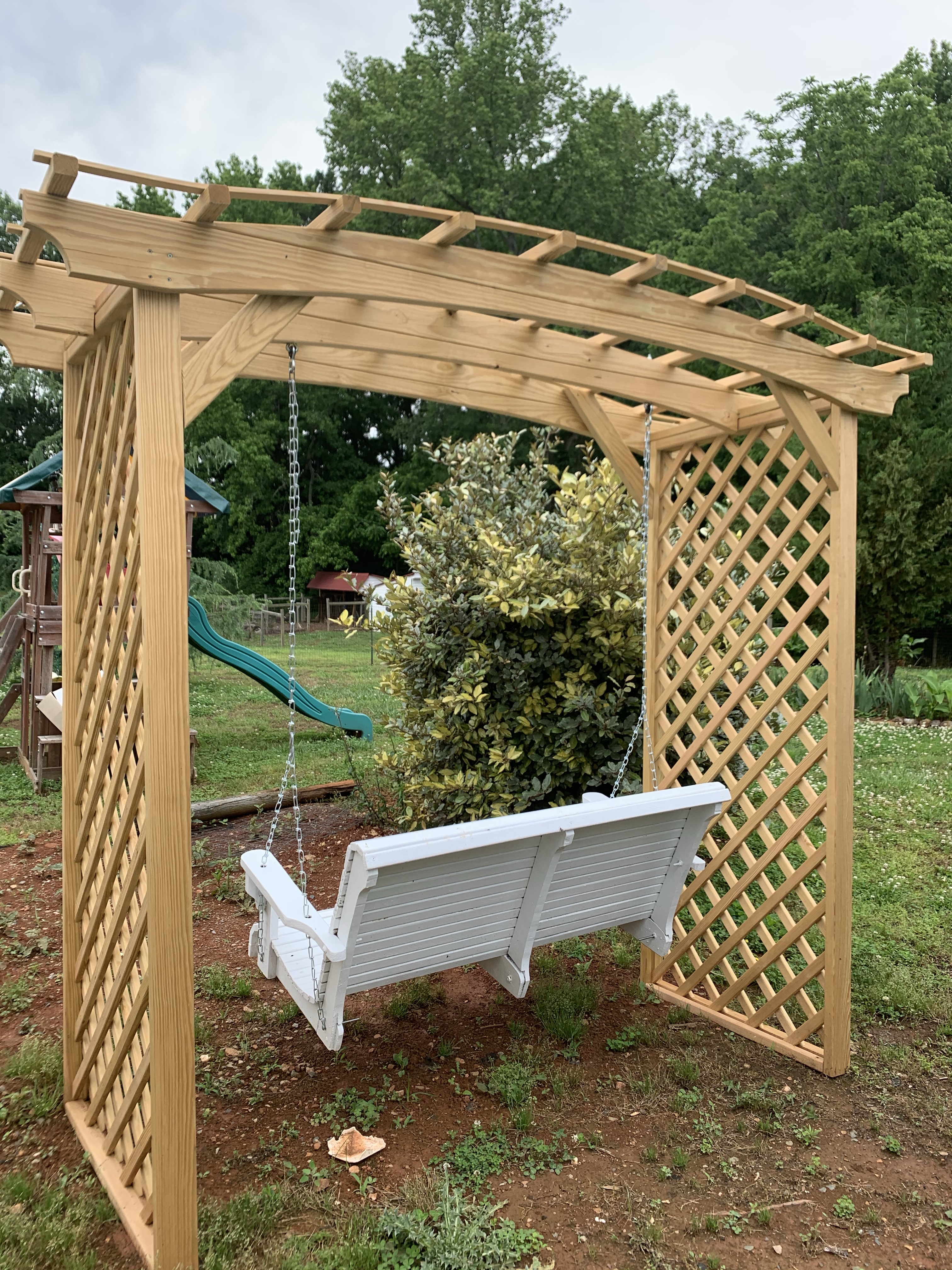 I’m so excited to have this swing at my house- finally! I miss my grandpa so much so I am happy to be able to have this gift he personally made for me. It looks so pretty hanging from the arbor. It brightens up our yard quite well!!