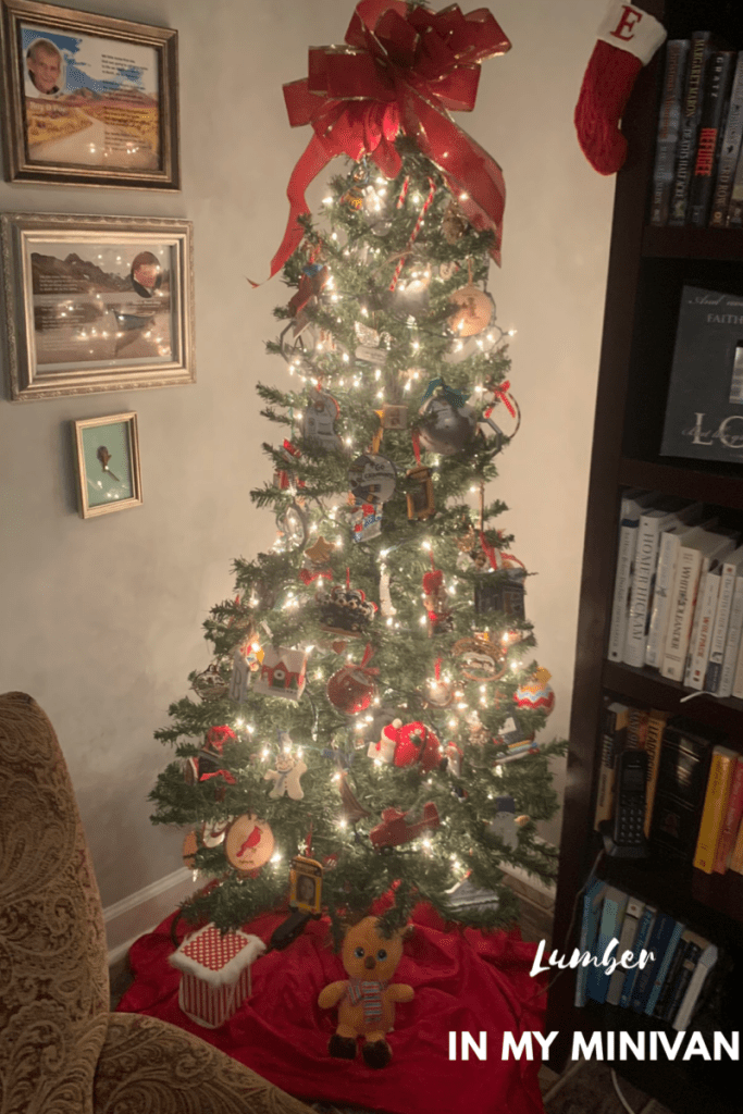 Our family room tree is small but packed with ornaments that represent life milestones and vacation souvenirs.