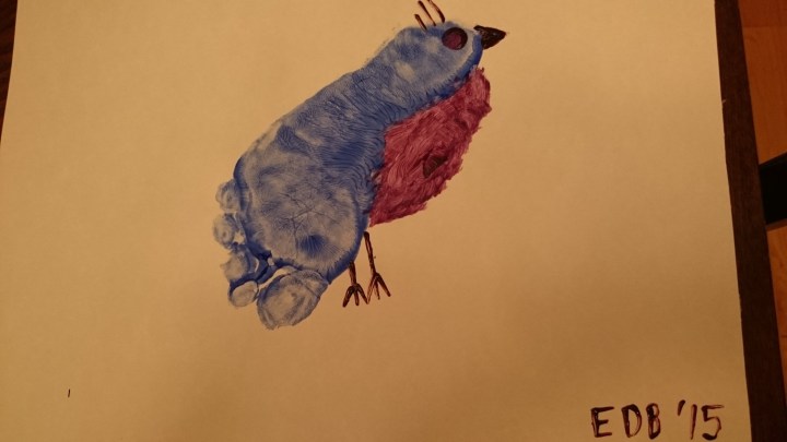 Paint the bottom of your child’s foot with your choice of washable paint. Then, simply freehand a roundish belly at the arch of the foot. Add little feet, an eye and a beak. You can add a little crest to the top of the bird’s head if you want.