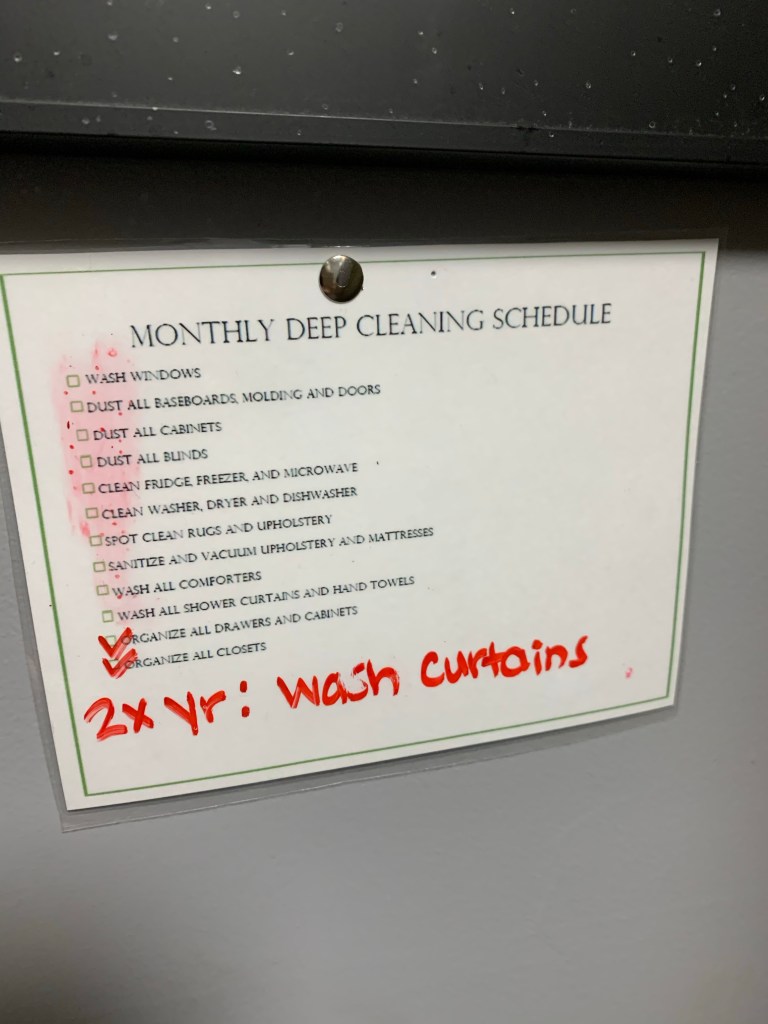 Our weekly cleaning schedule is laminated, framed, and hanging in our laundry room.