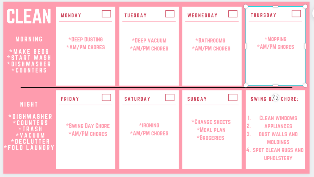 Typically we spend two weekends a month deep cleaning. While we are at home self quarantining, we are choosing to vigilantly follow a deep cleaning schedule. We are following our daily task schedule, but we are mopping and cleaning bathrooms twice a week. We are also making it a point to remove shoes at the door and do a deep cleaning task every weekend instead of every other weekend. The kids and I are trying to work together to make the chore of the day happen.