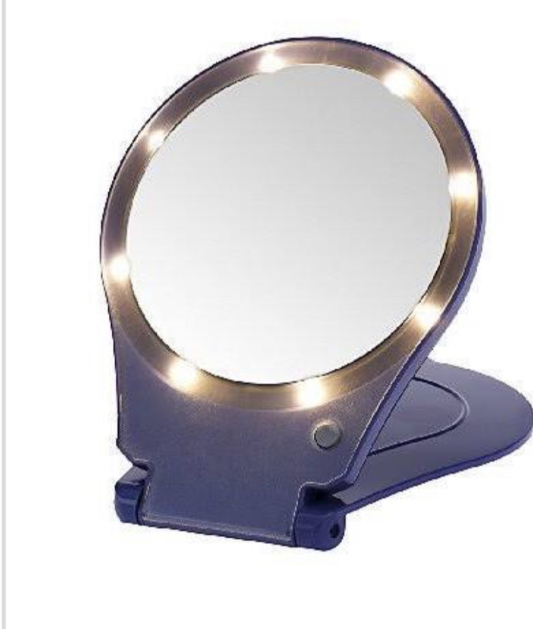This mirror is magnifying and lighted…and you can fold it up! It travels easily and is very handy. Get you one!