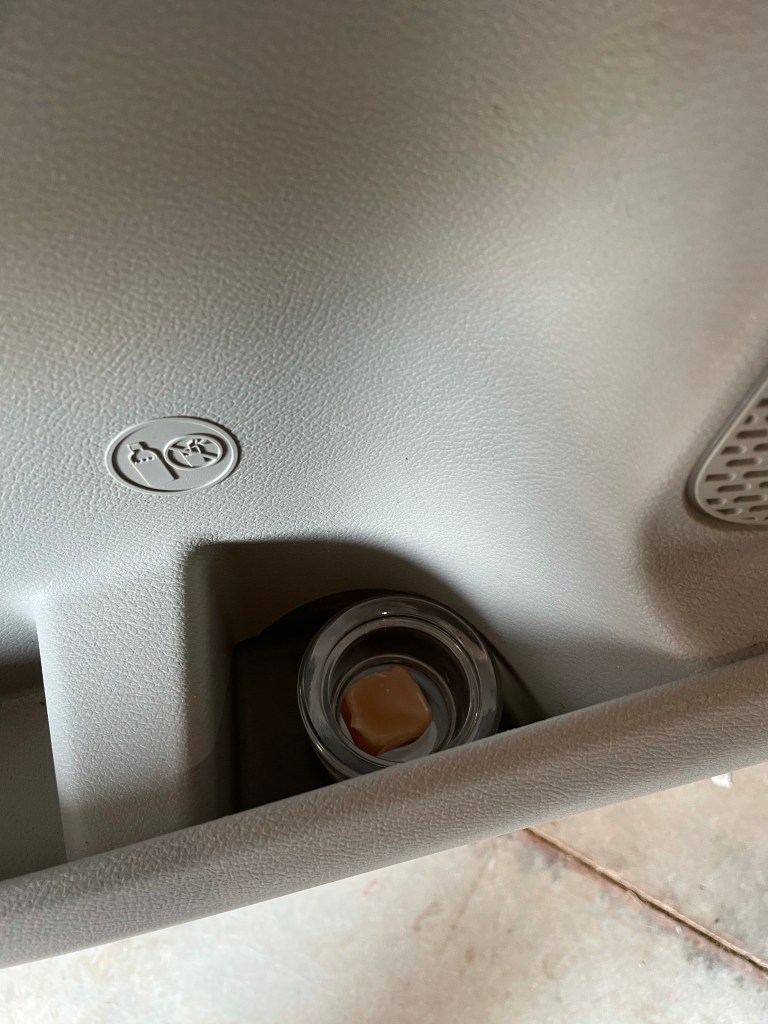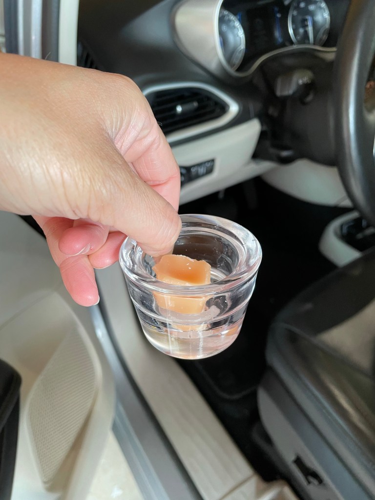 Get a simple glass jar and a candle tart in your favorite scent. Pop these things into your console or your doors. We have three in our van.