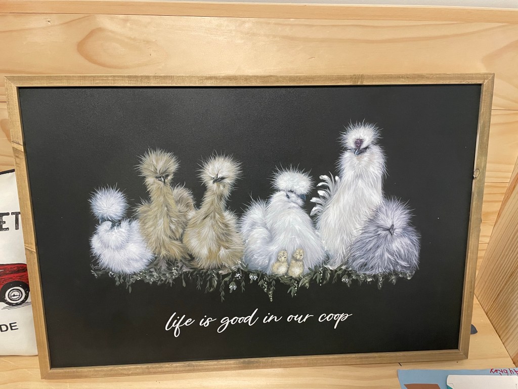 I had some gift cards to spend from Christmas, so I bought this picture. It has silkies on it, so it’s perfect for me. They look just like our chickens.