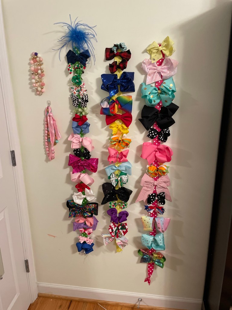 My ten year old no longer wants to wear hair bows, so she passed all of hers to my six year old. I had no idea we had so many bows.
