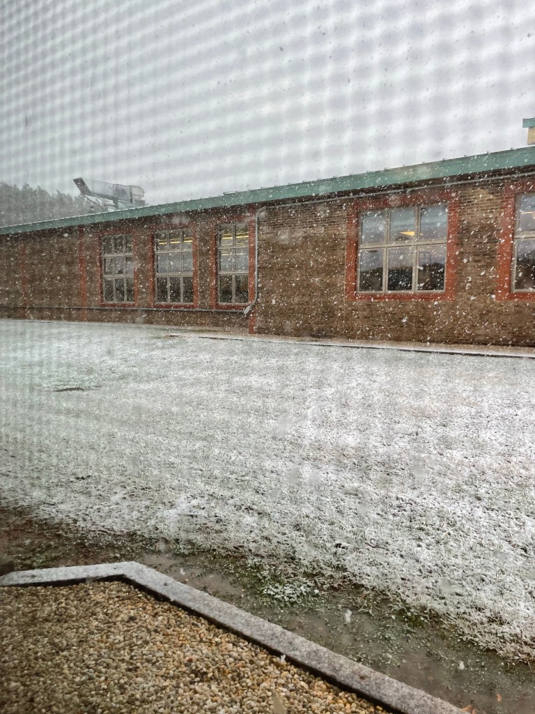On Monday, we woke up to one of the scariest storms I’ve ever seen. I live in North Carolina, so I have seen some pretty scary storms. The wind was howling and it was pouring rain. Mid morning, that turned into snow! It didn’t last long, but it was pretty. This was taken from my classroom window.