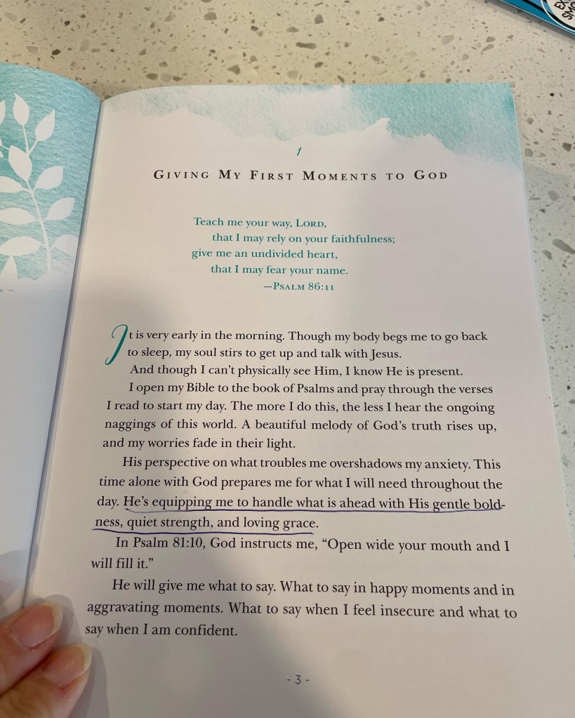 What I found was a collection of relatable, Biblical, and enjoyable devotions. TerKeurst was going through a valley in her own life when she was writing this devotion. One of the first evenings I read, she specifically spoke of praying through Psalms to calm an anxious mind.