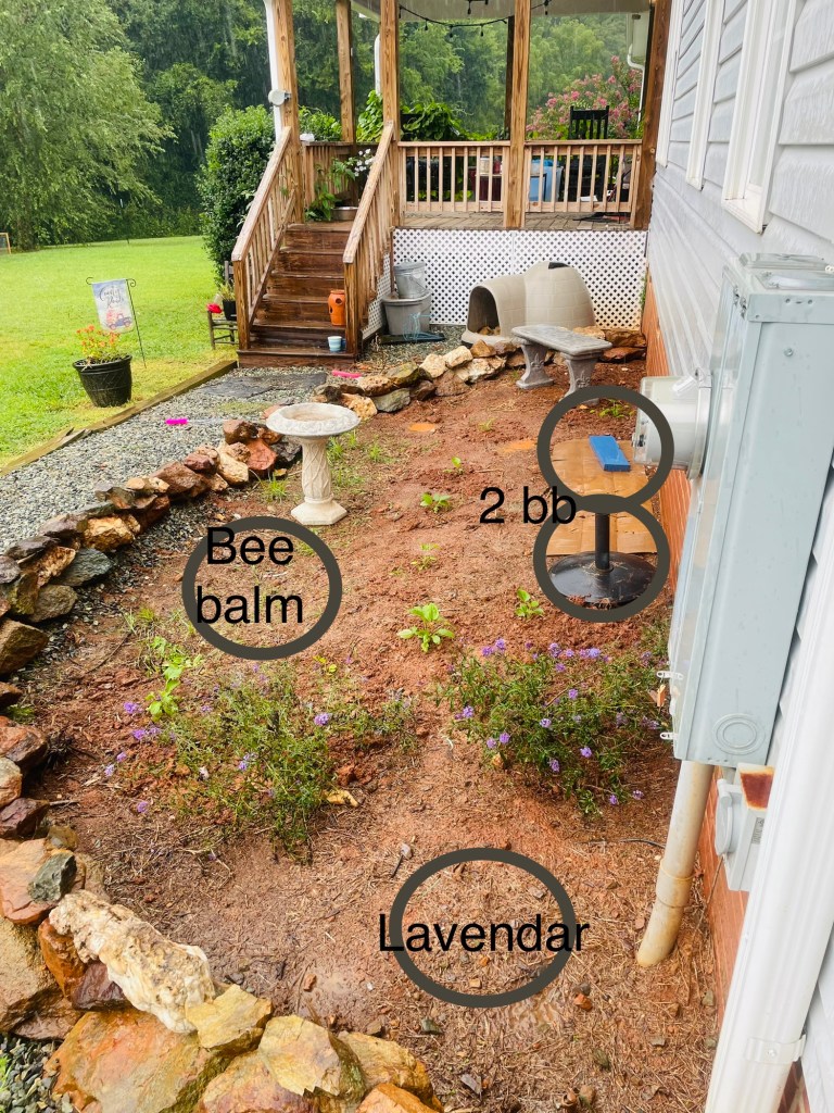 *Add 2 butterfly bushes, bee balm, and lavendar, as well as mulch and a pea gravel path to the flower bed