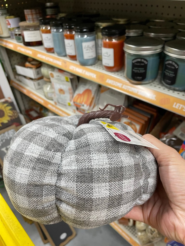 Dollar General has a lot of different sized cloth pumpkins, and a few different colors. I thought this gray plaid pumpkin was really cute. It’d be adorable paired with white dishes and candles. At only $8, you could buy a few of them.