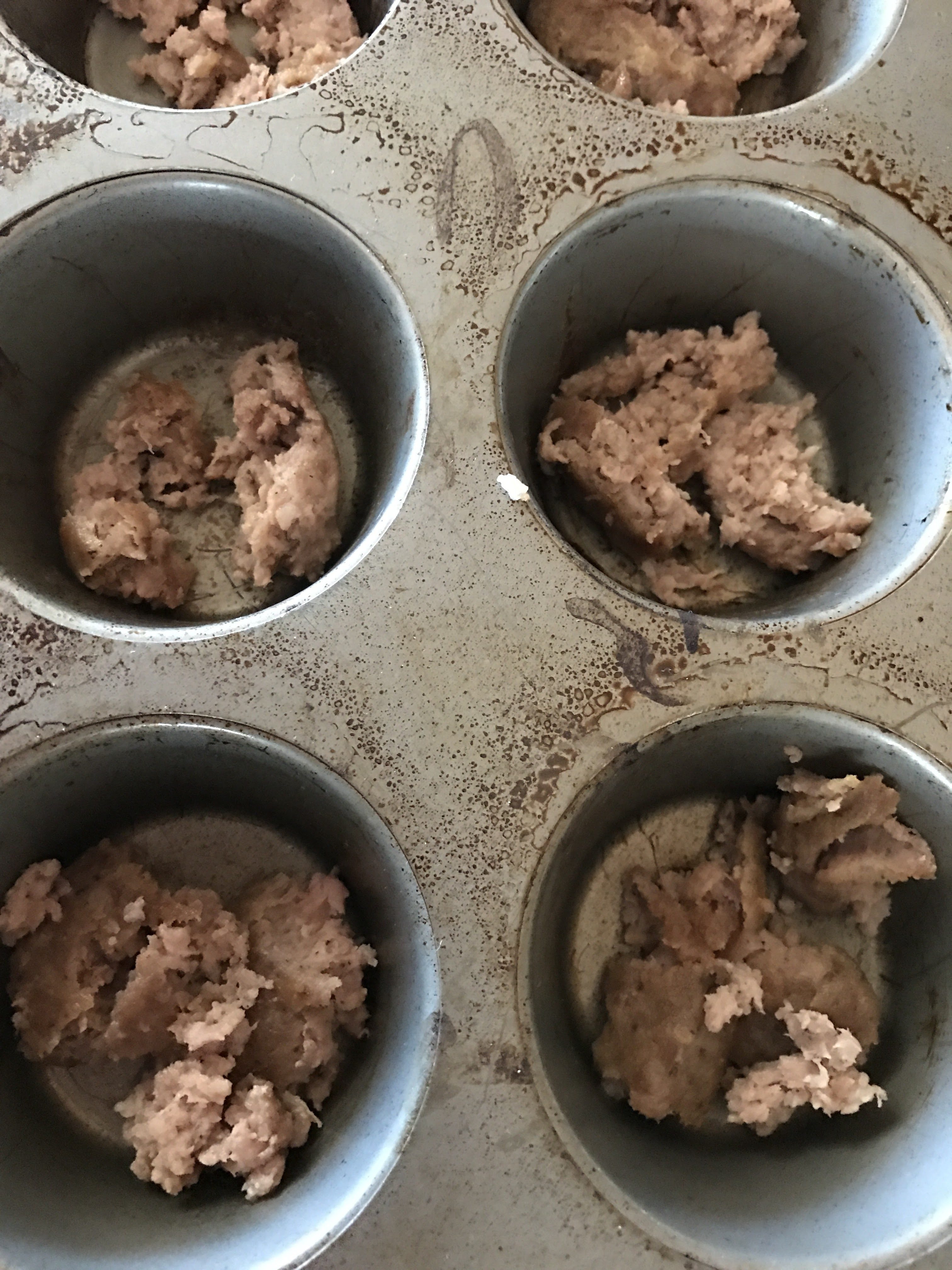 Then, put the sausage crumbles in the muffin tin and pour the mixture overtop of them.