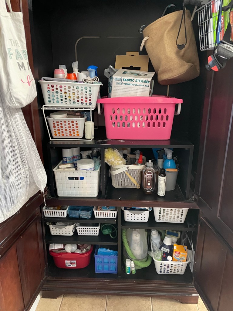 It’s very nice to have everything in one place, organized and not falling out when I open the door. I also have a specific place to put all the cleaning supplies. The top of the cabinet holds laundry baskets, cleaning rags, and laundry items. The middle of the cabinet holds extra cleaners and refills, a basket with general cleaning items that can be carried room to room, and a bathroom cleaning caddy. The lower shelves house candle wax melts, batteries, picture hanging hardware, tools, light bulbs, cabinet hardware, a rug and upholstery shampooer, and a basket of floor cleaners. Everything is grouped together by function and it helps so much.