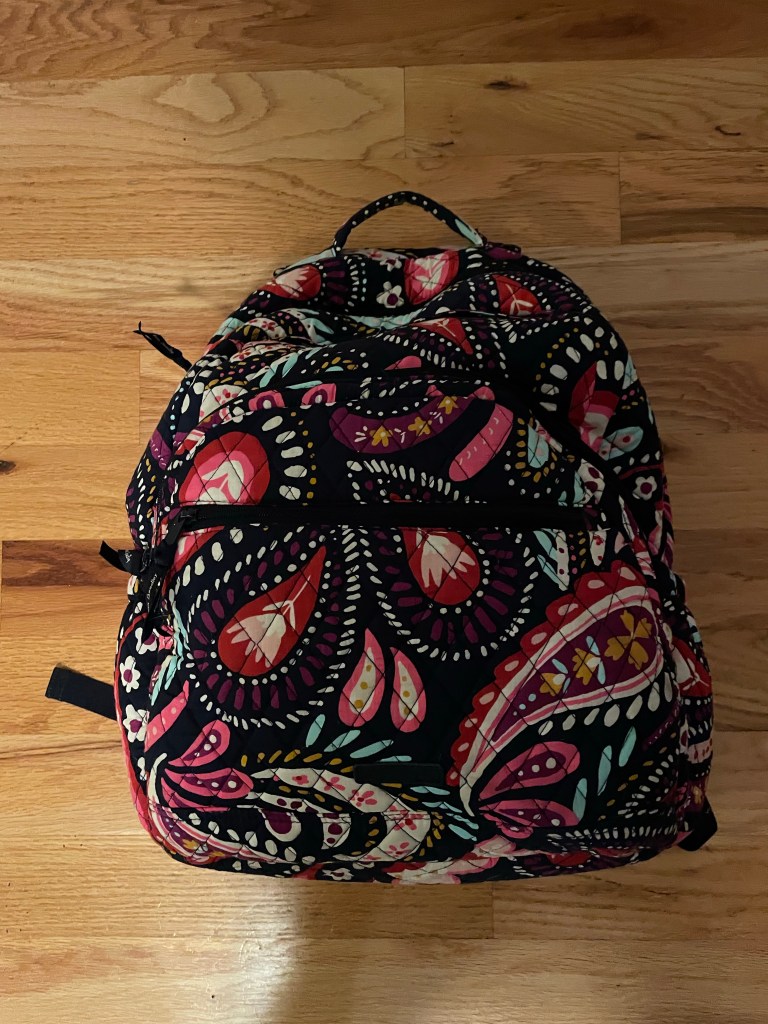 I’m a big believer in using what you have before buying something, so this is a Vera Bradley backpack I bought from a friend. It’s big enough to hold everything I need.