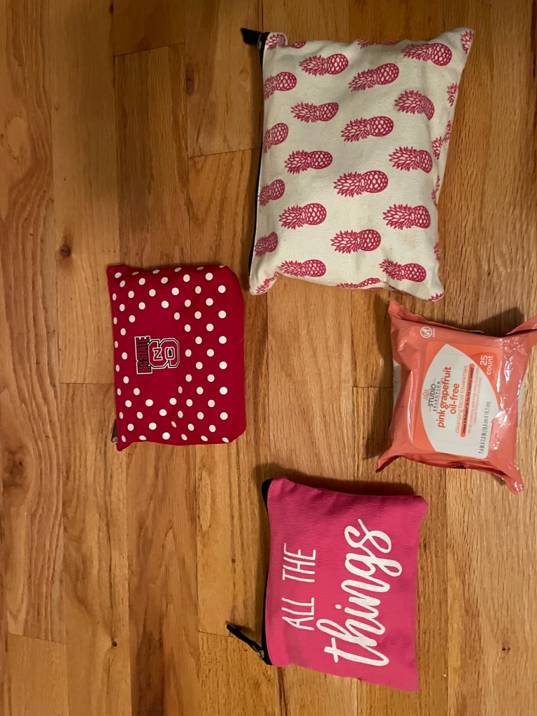 One pouch contains small shower items, feminine items, and the other contains makeup remover wipes, hair brush, hair elastics, deodorant and lotion.