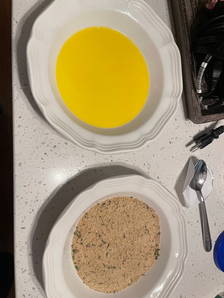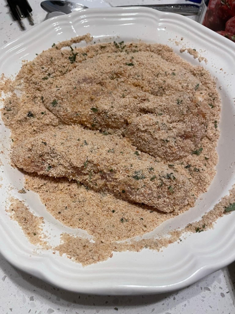 First, melt butter in a bowl and mix it with lemon juice. Then, put Italian bread crumbs in another bowl. You dip the chicken in the lemon juice and butter, and then roll the chicken in the bread crumbs.