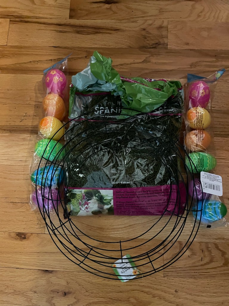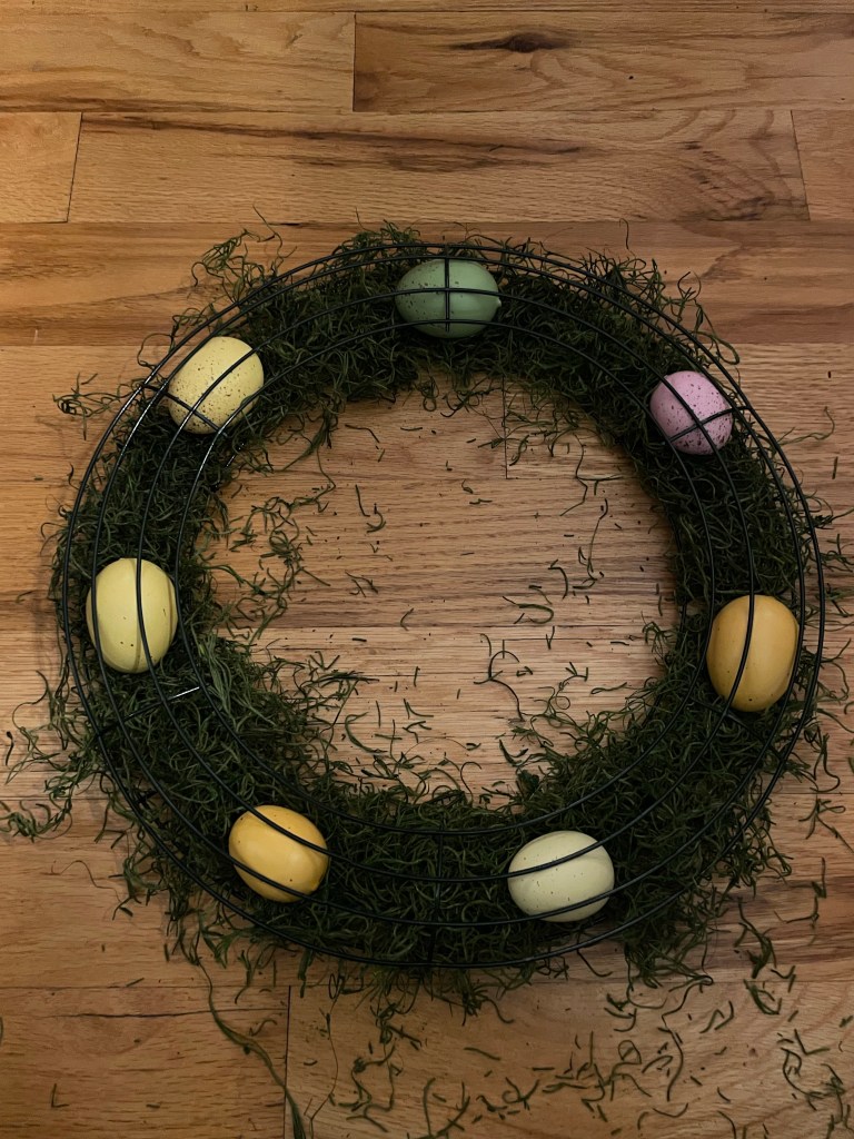 I have seen these adorable egg wreaths all over TikTok and Pinterest, and I just couldn’t wait to make one myself. I hit a few snags, but I have to say mine didn’t turn out too badly. To make your own, you will need the following: Spanish moss, faux eggs, and two wire wreath forms.