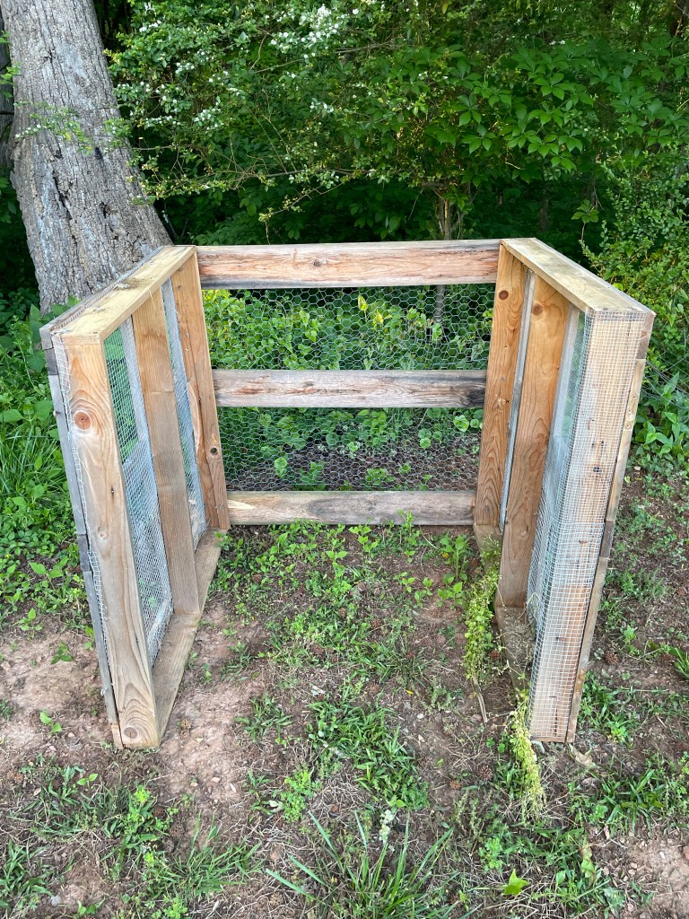 We wanted a composter, but couldn’t find one for less than $100. And since I wanted to have a three-column composter, I couldn’t justify spending $300-plus on the thing. I decided to repurpose part of the coop- the chicken run.