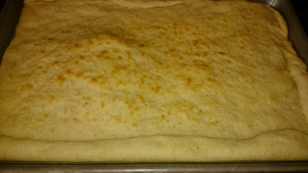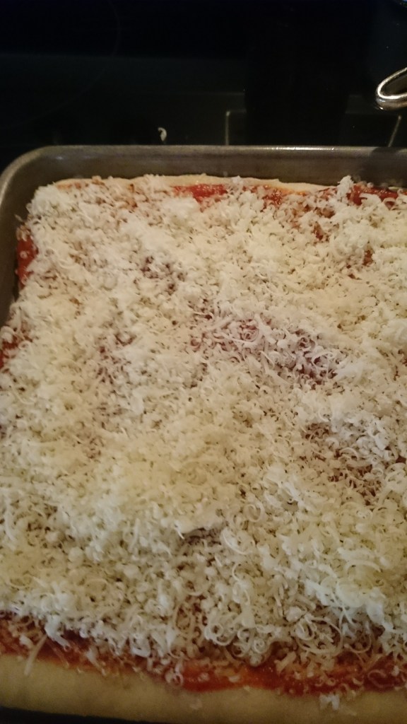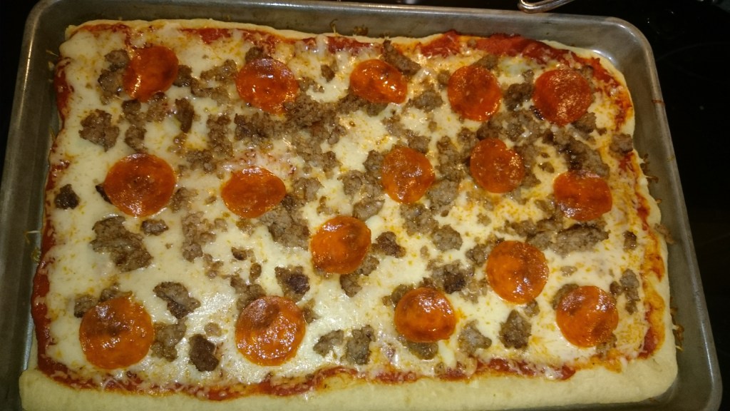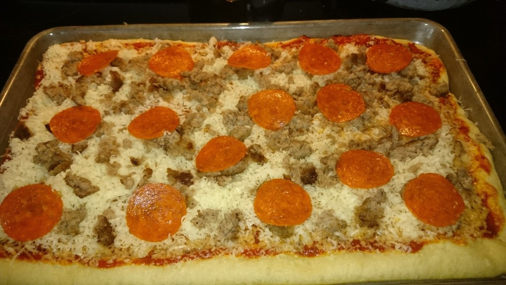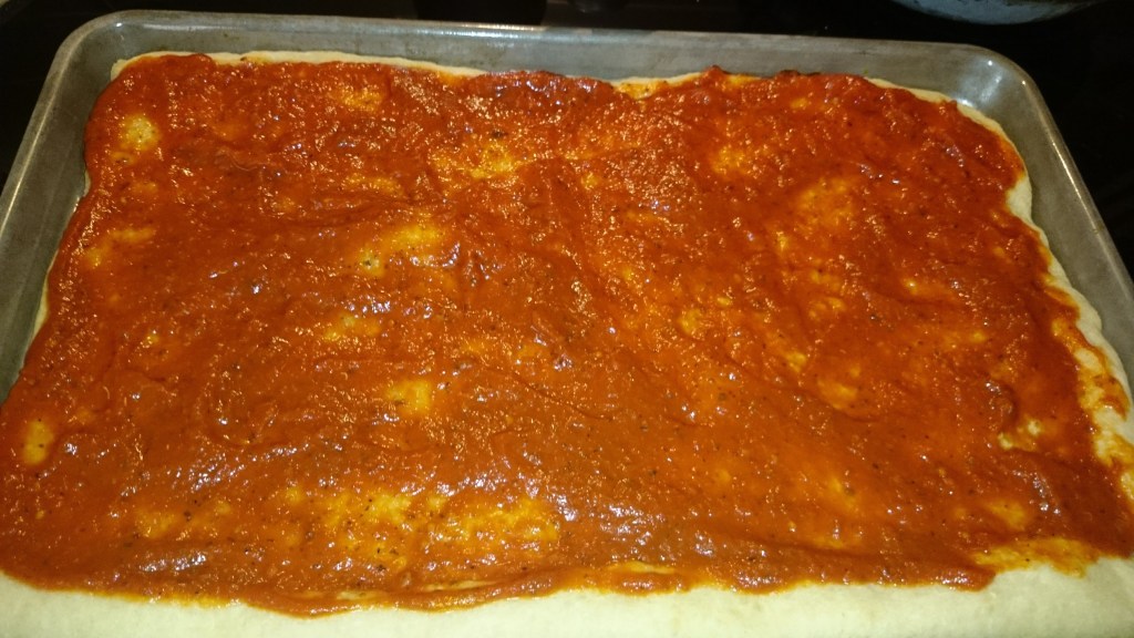 First, you’ll need a box of gluten free cup-for-cup flour. I like to use King Arthur Gluten-Free All-purpose flour. (HINT: You can also find a lot of great recipes on the King Arthur website. ) You’ll be using 1 1/2 cups of the flour. You’ll also need 2 table spoons nonfat dry milk, 1 teaspoon xantham gum, 1 1/2 teaspoons instant yeast, 3/4 teaspoons of salt, 1 tablespoon granulated sugar, 1 cup warm water, and 1/4 cup olive oil. To make the sauce, you’ll need one 28 oz can of crushed tomatoes, a small can of tomato sauce, a small diced onion, 1 tablespoon olive oil, 1 teaspoon garlic powder, 1 1/2 teaspoons crushed red pepper, salt and pepper to taste, and 1 tablespoon each of crushed oregano and basil leaves. You’ll also need shredded mozerella cheese and whatever toppings you’d like. We use fresh sausage and pepperoni.