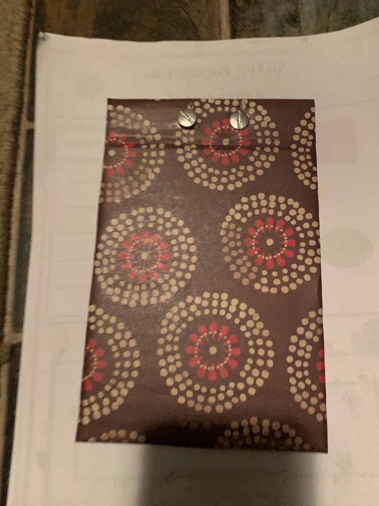 Make some holes in the “back cover” where you’ll attach your paper. We then use these postbound scrapbook extenders to attach the notebook paper or sticky notes to the notebook. This also makes them refillable. The flat side should be on the back of the notebook.