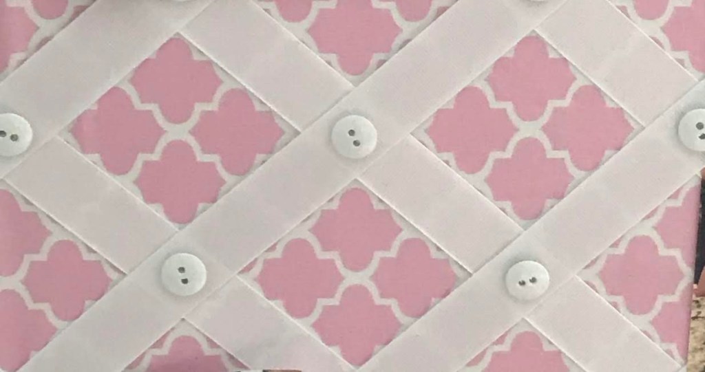 Then, I hot glued some ribbon in a criss-cross pattern and glued some buttons to areas where the ribbons intersected.