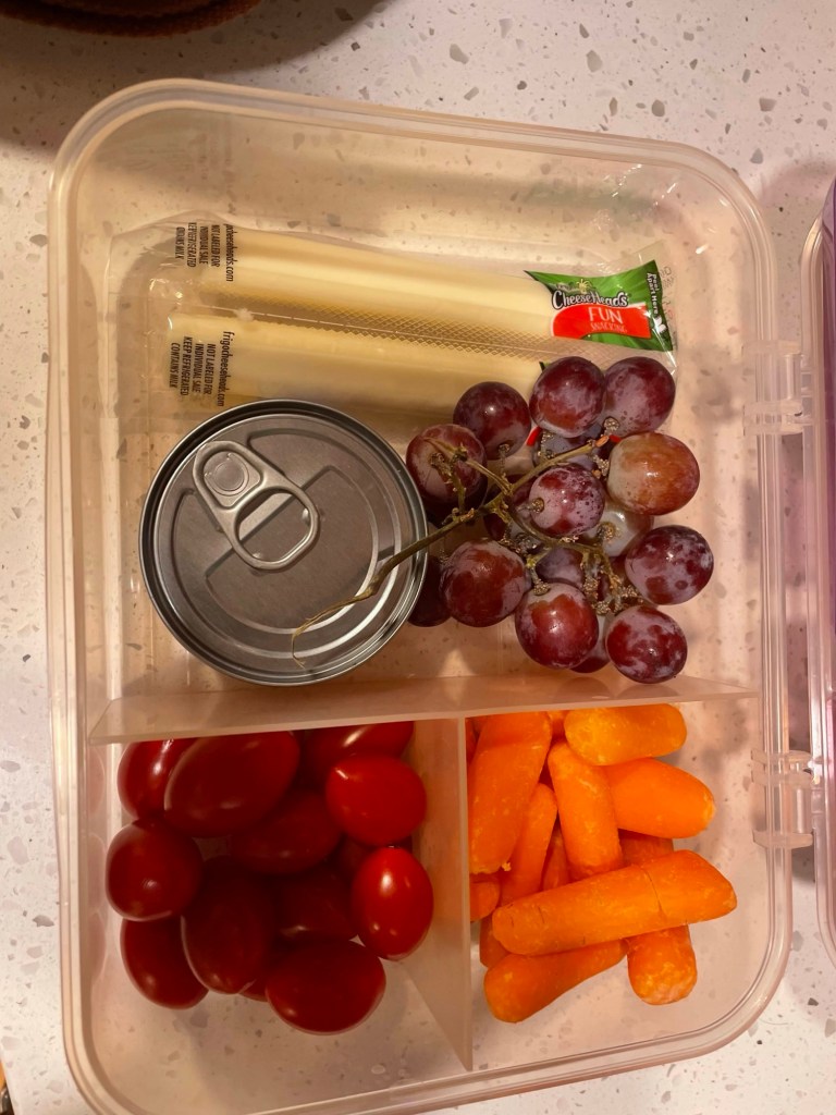 Canned tuna, cheese sticks, carrots, tomatoes, and grapes make up this bento box lunch.