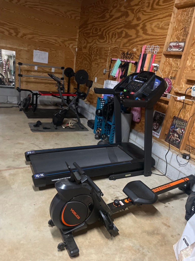 My gym area takes up the front half of the garage.