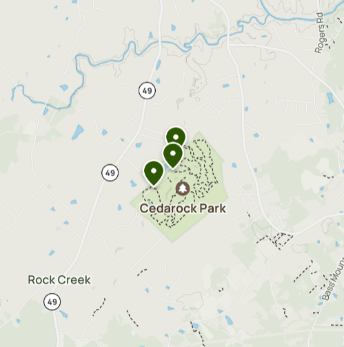 Are you an AllTrails user? There are three walking/hiking trails listed on the Cedarock Park page– two of the trails, Rock Creek Trail and Spoon Branch Trail, are classified as “easy.” Hikers who want something a bit more challenging should use the Rock Creek, Bridle, and Spoon Branch Loop- a 4.3 mile hike that is listed as “moderate.”