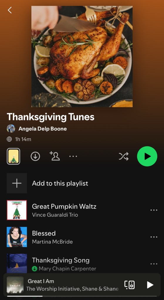Happy Thanksgiving week to you all! Today, instead of sharing a quote, I thought I’d share a little something fun: a Thanksgiving playlist. Worship is something that’s very important to me, so there are a good bit of praise and worship songs on here as well.