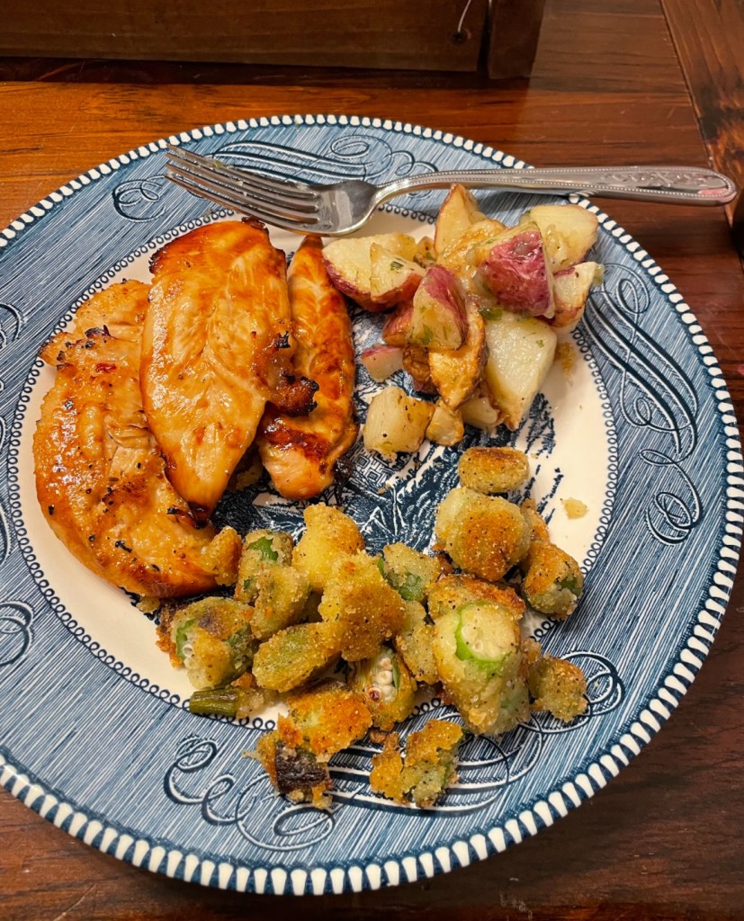 You guessed it- we live in a small town with no Cracker Barrel. You can make their famous grilled chicken tenders yourself. Simply marinate them in Italian dressing, honey, and lime juice and put them in the air fryer. Steam yourself some carrots or potatoes and fry up some breaded okra. The only thing missing are the corn muffins.